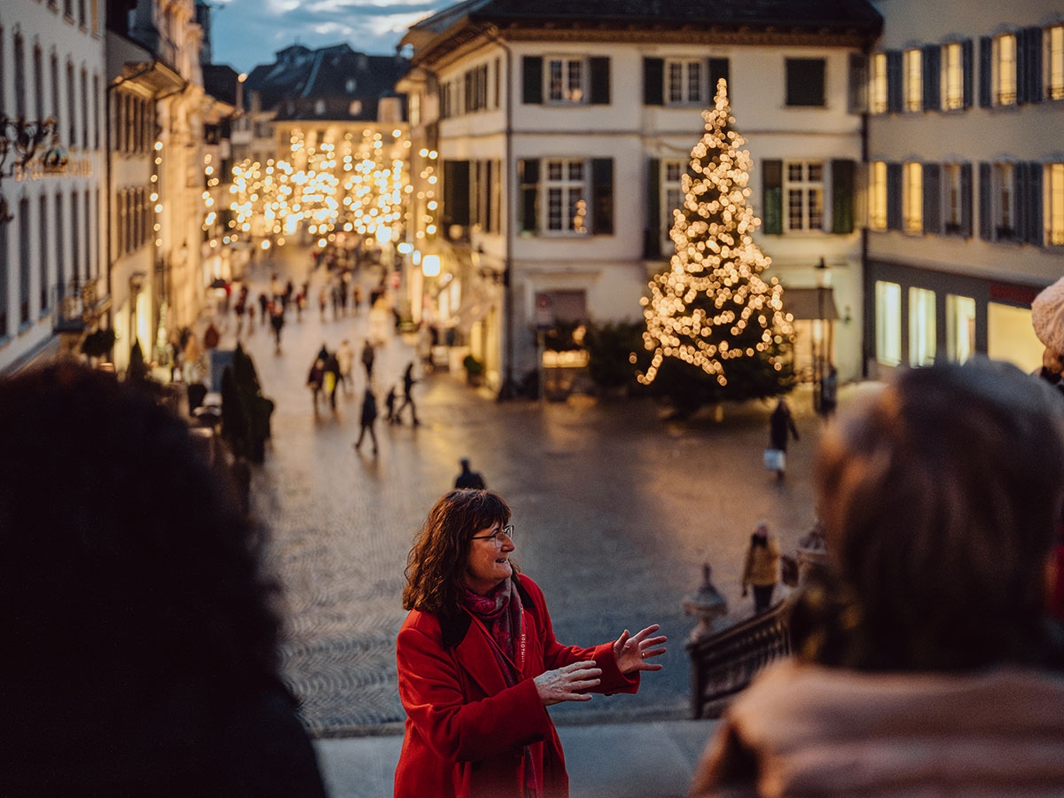 Eine besondere Adventsführung mit besinnlichem Gesang. Die Teilnehmenden tauchen in den winterlichen Charme von Solothurn ein und erleben die Altstadt in der Vorweihnachtszeit. Zu hören sind ausserdem Geschichten von weihnachtlichen Bräuchen und Traditionen. Der Wechsel von Wort und klangvoller Musik der Sopranistin Imogen Baker ergänzt sich und stimmt auf Weihnachten ein.
