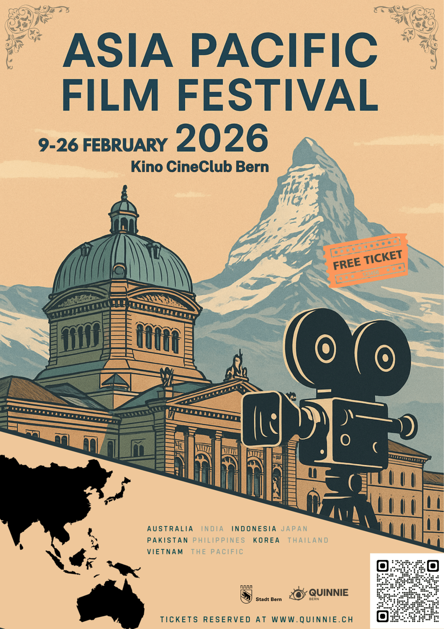 Between 9 and 26 February 2026, the embassies of Indonesia, Pacific Islands, Vietnam, Korea, the Philippines, Thailand, India, Pakistan, Japan and Australia, with the support of the City of Bern, will offer free film screenings at the Quinnie Cinema in Bern.