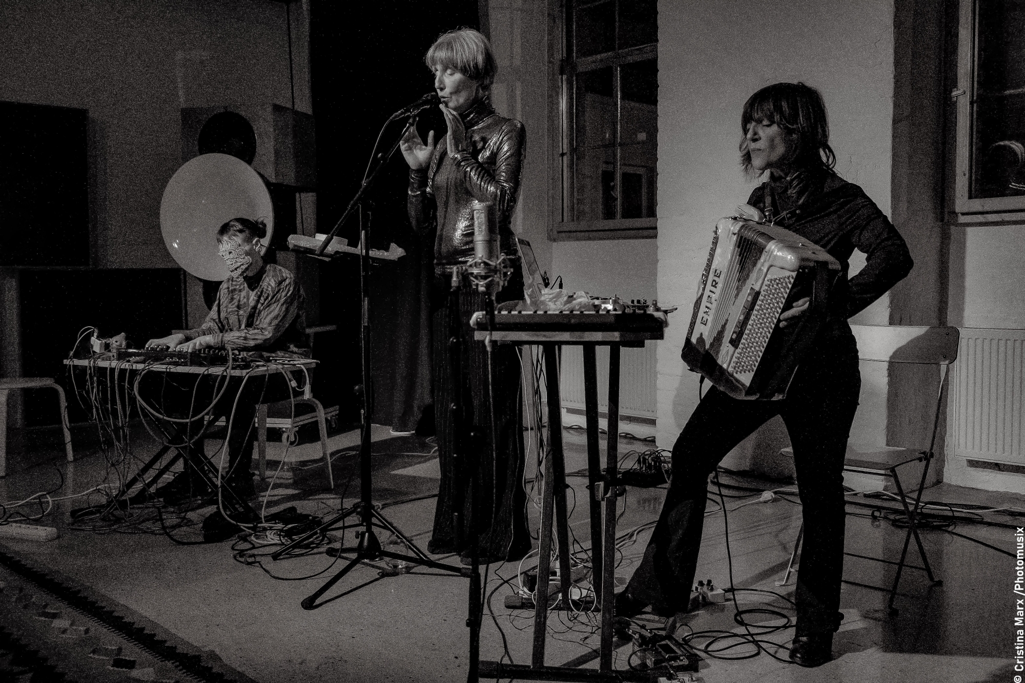Das Trio Kosack-Parkins-Wassermann steht ganz im Sinne der Jazzwerkstatt – jede Musikerin bringt ihre einzigartige Stimme mit in eine ganz neue Formation. Alle spielen auf unkonventionelle Art und Weise mit ihren Instrumenten. Liz Kosack lässt ihr Keyboard flüstern, flöten und schimmern. Andrea Parkins bearbeitet ihr Akkordeon elektronisch und experimentiert mit Feedback, Verzerrung, Klangdichte und Drone. Schlussendlich fügt Ute Wassermanns Gesang diesem Mix Klänge hinzu, die zwischen elektronischen, animalischen, anorganischen und menschlichen Eigenschaften oszillieren.