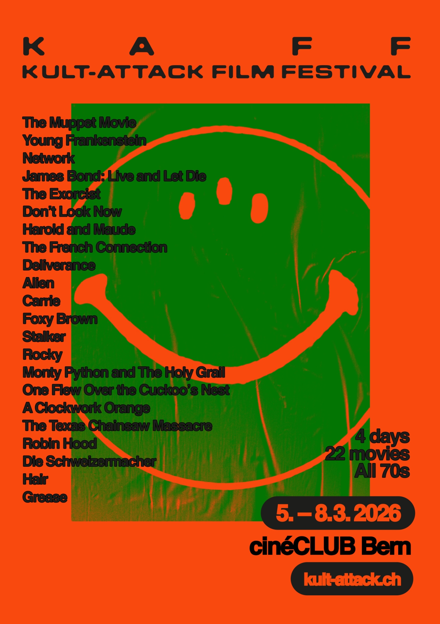Willkommen in den Seventies – dem wildesten Jahrzehnt der Filmgeschichte! 4 Tage lang tauchen wir ein in eine Ära, die das Kino für immer verändert hat. 22 Kultklassiker, 2415 Minuten pure Leinwandmagie. Die Siebziger waren ein Trip – im wahrsten Sinne des Wortes. Sechs unserer Filme kreisen entsprechend um Drogen, Rausch und Realitätsverlust. James Bond jagt Drogenbarone, die Detectives Popeye & Cloudy kämpfen gegen den Heroin-Schmuggel, während in «Hair» eine ganze Generation den Bewusstseinswandel feiert. Das Jahrzehnt zeigte uns aber auch: Der menschliche Geist ist zerbrechlich. In «A Clockwork Orange» zerreisst die Gewalt jede Moral, «One Flew Over the Cuckoo’s Nest» entlarvt die Anstalt als Gefängnis, und «Don’t Look Now» lässt venezianische Gassen zum Albtraum werden. Psychosen auf Zelluloid – verstörend, faszinierend, unvergesslich. Doch die Seventies gehörten auch starken Frauen. Unser Triple Female Power Friday zelebriert drei Ikonen: Pam Grier rächt sich in «Foxy Brown», Sigourney Weaver kämpft in «Alien» ums Überleben und Sissy Spacek entfesselt in «Carrie» telekinetische Kräfte. Natürlich wird auch an der vierten Ausgabe des KAFF der Spass nicht fehlen. «Grease» lädt zum Sing-Along ein, «Young Frankenstein» parodiert, Disneys «Robin Hood» erfreut Gross und Klein und Monty Pythons Ritter der Kokosnuss suchen den «Holy Grail». Mit «Network» wird’s dann bissig – eine Mediensatire, die heute aktueller ist denn je. Apropos aktuell: «Die Schweizermacher» ist der beste Schweizer Film aller Zeiten und somit ein Pflichtprogramm für die Gen Z. Wer Gänsehaut liebt, kommt jeweils zu später Stunde auf seine Kosten: «The Texas Chainsaw Massacre» und «The Exorcist» definierten Horror neu. Und für die Cineasten haben wir Perlen wie Tarkowskis «Stalker» oder die skurrile Liebesgeschichte «Harold and Maude» im Programm – perfekt fürs Aufwerten deines Letterboxd-Portfolios. Die Seventies hatten alles. Und wir zeigen alles. Schön bist du dabei!
