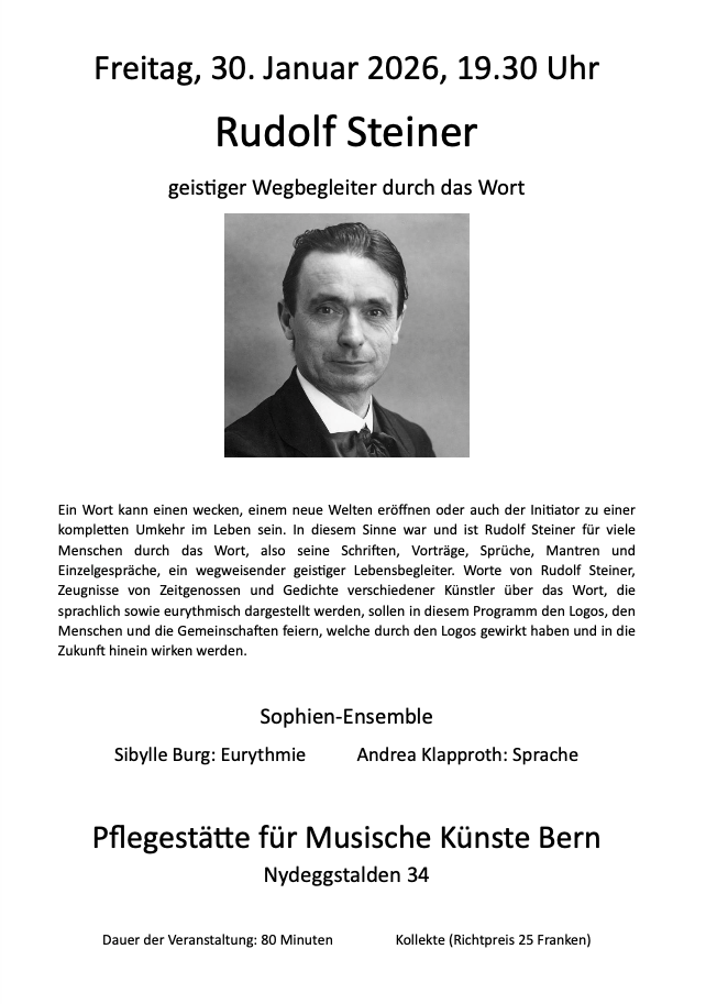 Ein Wort kann einen wecken, einem neue Welten eröffnen oder auch der Initiator zu einer kompletten Umkehr im Leben sein. In diesem Sinne war und ist Rudolf Steiner für viele Menschen durch das Wort, also seine Schriften, Vorträge, Sprüche, Mantren und Einzelgespräche, ein wegweisender geistiger Lebensbegleiter. Worte von Rudolf Steiner, Zeugnisse von Zeitgenossen und Gedichte verschiedener Künstler über das Wort, die sprachlich sowie eurhmisch dargestellt werden, sollen in diesem Programm den Logos, den Menschen und die Gemeinschaften feiern, welche durch den Logos gewirkt haben und in die Zukunft hinein wirken werden.