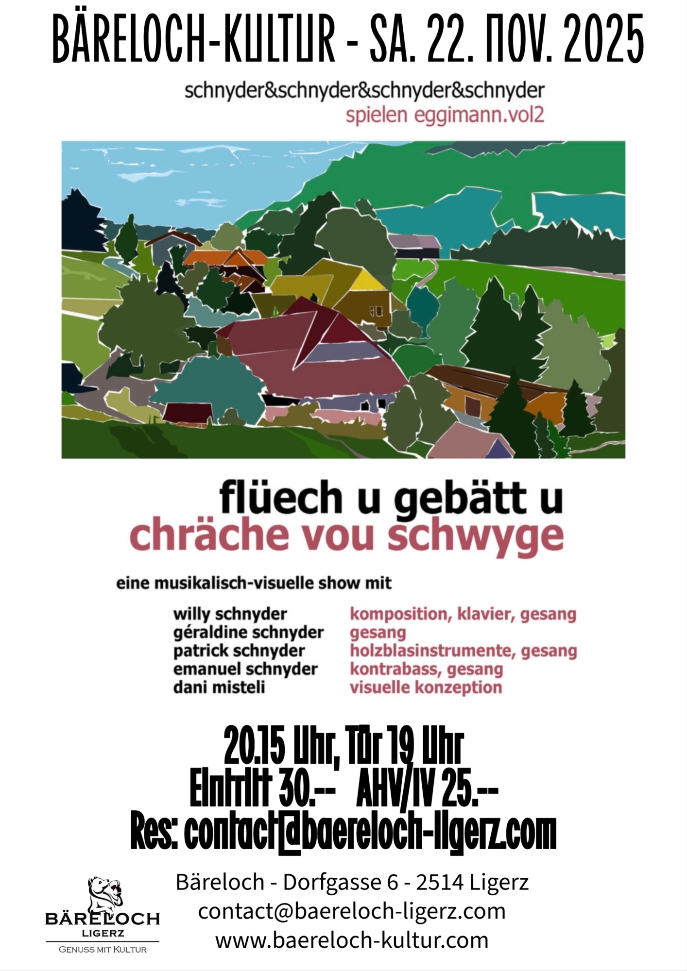 Mit dem visuell-musikalischen Projekt «schnyder&schnyder&schnyder&schnyder spielen Eggimann» bringt Willy Schnyders seine mehr als hundert Werke umfassende Sammlung von Eggimann-Vertonungen auf die Bühne. Mitwirkende sind der bekannte Basler Bassist Emanuel Schnyder, der Holzbläser Patrick Schnyder, die junge Jazzsängerin Géraldine Schnyder und Willy Schnyder am Flügel. Zusammen mit seinem Freund und Illustrator, Daniel Misteli, wird eine Performanceartige Bühnensituation erschaffen. Durch das Verbinden von Wort, Musik und projektierten Bildern erlebt das Publikum eine künstlerisch reizvolle, moderne «Stubete».