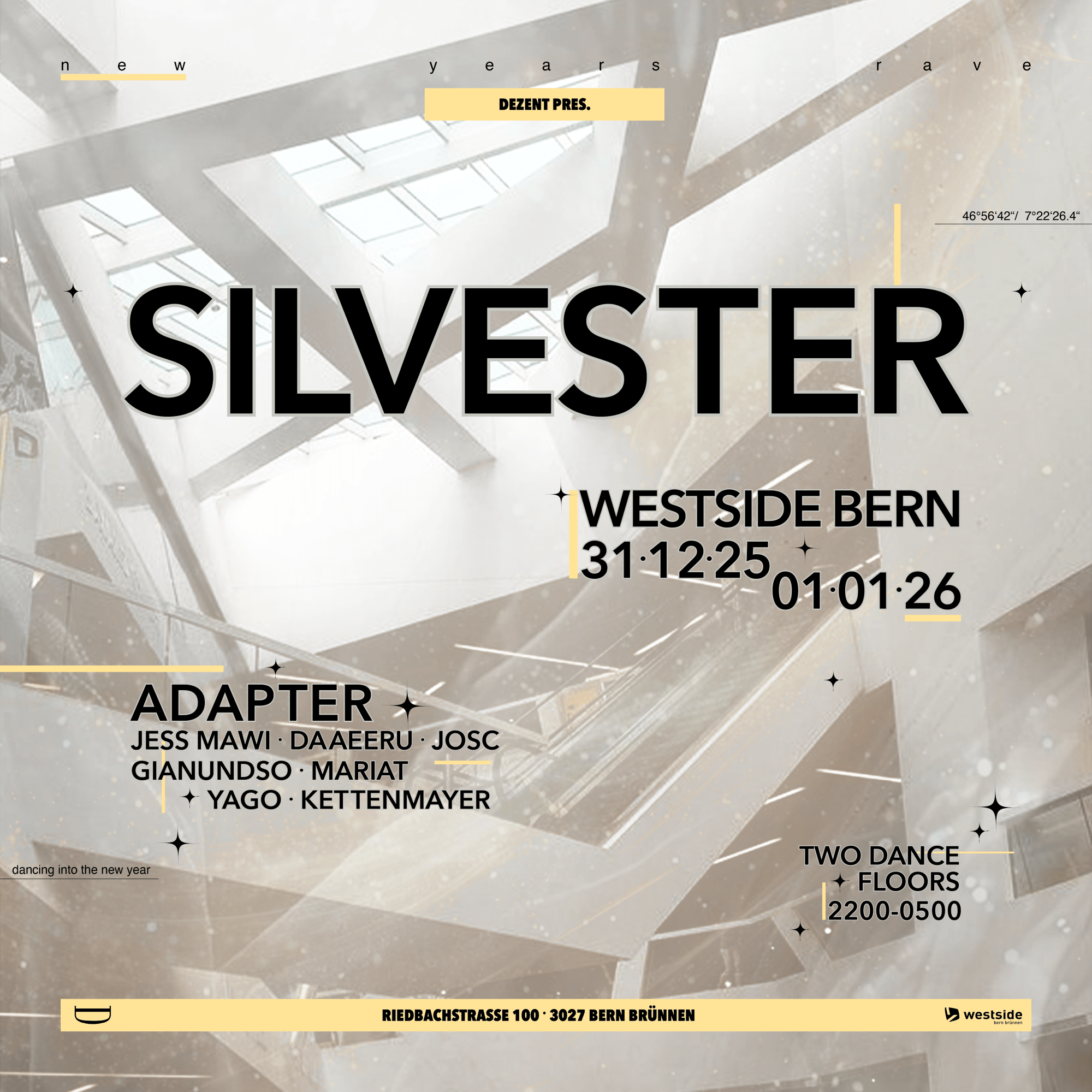 Celebrate New Year’s Eve with us at Westside Bern. We’re taking over two dancefloors, each with its own unique vibe. On the Foodcourt Floor, you can lose yourself to Afro House, while the Garage Floor delivers Tech House featuring Adapter from Italy, bringing his signature sound to the night.