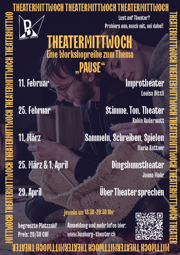 Wer Lust hat, erste Bühnenerfahrung zu sammeln, dem fehlt es in Bern oft an Angeboten – vor allem, wenn man nicht die Kapazität für ein ganzes Theaterstück hat. Unsere Workshopreihe Theatermittwoch öffnet deshalb den Vorhang für alle über 18, die in die Welt des Theaters eintauchen wollen! Wir bieten nach dem erfolgreichen Start im Herbst 2025 auch im Frühling 2026 wieder sechs professionell angeleitete Workshops zu verschiedenen Teilaspekten des Theaters – schreiben, bewegen, klingen, sehen, spielen. Diese Workshops sind offen für alle, unabhängig von bisheriger Erfahrung.