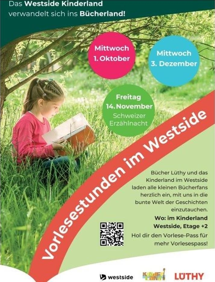 Das Kinderland verwandelt sich ins Bücherland! In gemütlicher Atmosphäre lesen wir einmal im Monat spannende, lustige und fantasievolle Geschichten vor, die zum Träumen, Lachen und Mitmachen einladen. Ob spannende Abenteuer, lustige Tiere oder zauberhafte Abenteuer – bei uns ist für jedes Kind etwas dabei! Übrigens: Hol dir den Vorlese-Pass bei Bücher Lüthy im Westside, sammle Sticker und erhalte eine kleine Überraschung.