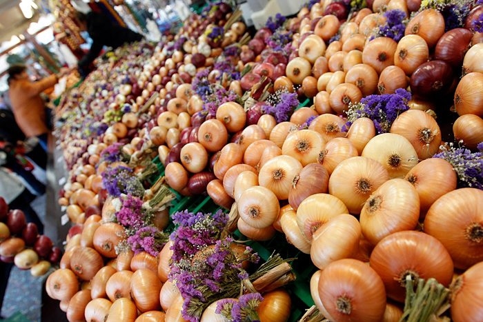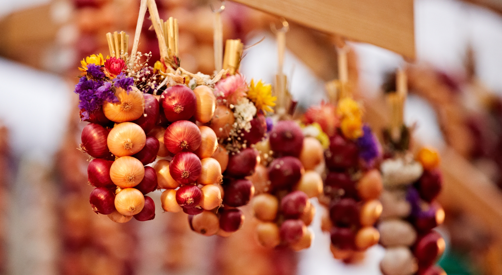 An mehr als 200 Ständen gibt’s kunstvoll geflochtene Zwiebelzöpfe, -kränze und -figuren in jeglichen Varianten zu bewundern und kaufen: Von meterlangen Riesenzöpfen mit weissen und roten Zwiebeln über Gestecke mit Trockenblumensträusschen bis hin zu verzierten Mini-Zöpfchen.